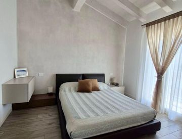 Rifinito con finiture di pregio e travi a vista bianche che rendono l’ambiente ancora più accogliente.