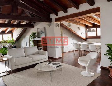 L’immobile occupa l’intero piano sottotetto della villa e si sviluppa seguendo fedelmente l’andamento della copertura, dando vita a spazi non convenzionali, articolati e mai banali. Non si tratta del classico appartamento con ambienti rigidamente definiti, ma di una casa da vivere e interpretare, dove ogni zona dialoga con le travi, le altezze e la luce naturale, creando un’atmosfera intima e sofisticata.