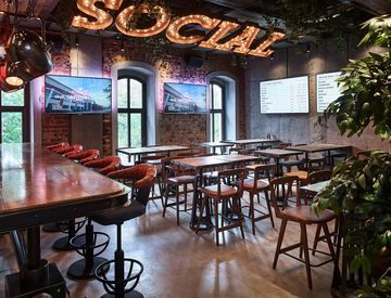 su tavoli e sgabelli alti, bancone con banchi frigo e vetrine refrigerate e zona cassa.