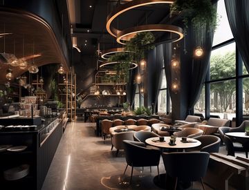 Al piano terra abbiamo la zona Cocktail Bar completamente attrezzata con splendido bancone con 2 postazioni barman complete ed ulteriori sedute su sgabelli, accompagnate da un importante e moderno espositore per il beverage.