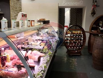 All' ingresso sulla parte sinistra è presente un banco esposizione refrigerato di 3 metri con retro banco con due affettatrici trifase, un tritacarne e lavello. Sulla parte sinistra sono presenti degli espositori di vini, un frigo per bevande, poltrone e tavolini e infine un mobile per la cassa.
