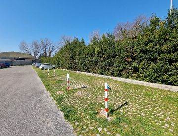 Ogni posto auto è delimitato da paletti e catena. Cancello automatico condominiale, ottima pavimentazione ed ampio spazio di manovra.