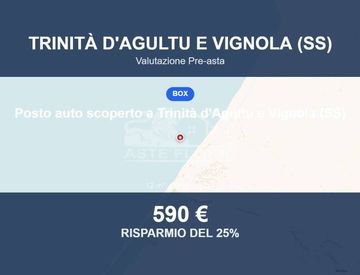 Posto auto scoperto in asta a Trinità d’Agultu e Vignola (SS) – Via Petra Bianca (CAP 07038) Posto auto scoperto in Trinità d’Agultu e Vignola, situato alla periferia del centro urbano, sul versante sud-ovest. Il fabbricato è costituito da un piano interrato, un piano terra, un piano primo e un piano secondo. Superficie e distribuzione interna Posto auto scoperto di 12 mq, situato al piano terra. Caratteristiche e dotazioni Il posto auto non è definito...