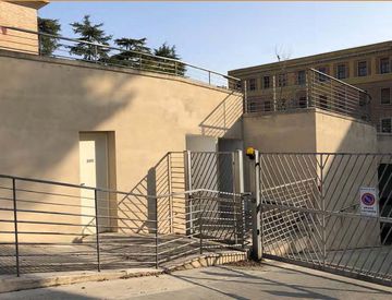 L’ingresso avviene dalla porta tagliafuoco pedonale posizionata in adiacenza all’uscita della scala antincendio dei garage e dopo uno stretto corridoio in pendenza si giunge all’ampio magazzino. Il locale ha come copertura il solaio prefabbricato posto sotto la piazza esterna condominiale.