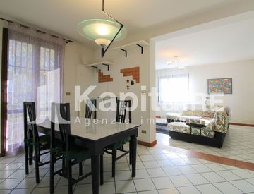 P. R. - Ampio ingresso dal portico che conduce a uno spazioso soggiorno affacciato su sala da pranzo con cucinotto; completano il piano un disimpegno, un bagno e un pratico ripostiglio.