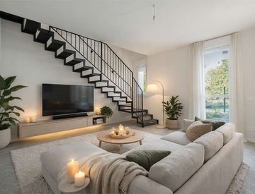 Le finiture interne e l'effetto del soffitto con le travi a vista in legno con doppi volumi rendono questa soluzione moderna e di tendenza.