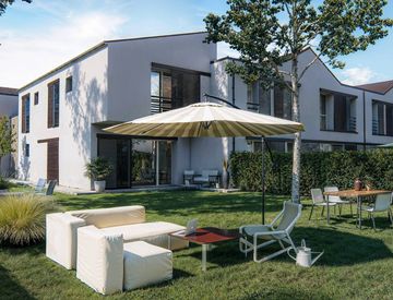 In questo contesto esclusivo proponiamo in vendita villa a schiera di nuova costruzione con ingresso indipendente, garage e giardino privato di 410 mq, una metratura rara per le nuove costruzioni.