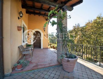 La proprietà è circondata da un curato giardino di circa 2.500 mq, perfettamente godibile e panoramico, con area parcheggio e box auto di 65 mq, un orto.