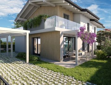 AGM Immobiliare propone in esclusiva una splendida villa bifamiliare di nuova costruzione con ingresso indipendente e giardino privato, situata in una zona residenziale elegante, silenziosa e immersa nel verde di Almè, a pochi passi da scuole, negozi e principali servizi.