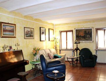Completano la proprietà un lungo portico, ampio cortile, due box auto e un magazzino.