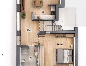 L'immobile, disposto su due livelli, si sviluppa al piano rialzato con ingresso in accogliente soggiorno pranzo con angolo cottura, disimpegno, bagno e una comoda camera da letto. Completa il piano un piacevole patio retrostante, perfetto per momenti di relax all'aperto.