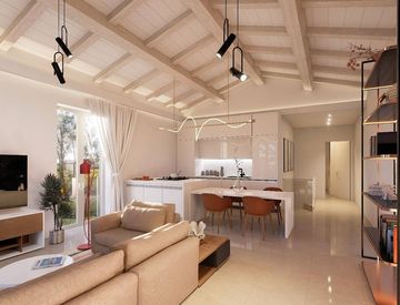 La villa è libera su tre lati e corredata da giardino esclusivo recintato, con area parcheggio privata chiusa da cancello carrabile. Sul fronte sud, ottimamente esposto, un elegante pergolato introduce alla luminosa zona giorno, caratterizzata da un raffinato soffitto in legno sbiancato che dona calore e fascino all'ambiente.