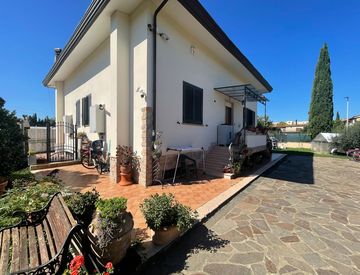 Villetta bifamiliare ristrutturata di 220 mq circa disposta su due livelli fuori terra composta da due ingressi, due camerette/studi, quattro camere matrimoniali, sei servizi, zona living con cucina, taverna, ampio giardino privato e accessi carrabili.