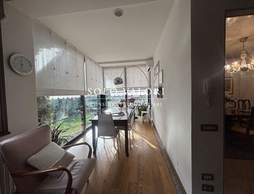 All'ingresso, un accogliente studio introduce l'ospite all’ampio soggiorno luminoso che comunica con la sala pranzo, creando uno spazio ideale per momenti conviviali. La cucina è contigua ad un grazioso tinello, pensato per colazioni informali o pranzi familiari.