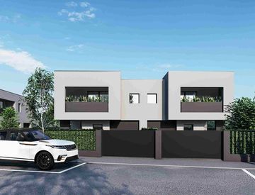 Bifamiliare a due piani orientata verso nord, est ed ovest. Disporrà di un giardino da 285m² e di un portico da 44m². Al piano terra troveremo una zona soggiorno - cucina molto spaziosa da 65m², dotata di ampie finestre scorrevoli, un bagno, un ripostiglio, un garage ed un disimpegno. Salendo al primo piano troveremo una camera patronale, una camera doppia, due camere singole, due bagni di cui uno ad uso esclusivo della camera patronale, un disimpegno...
