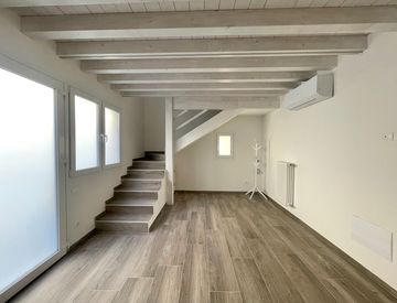 L'immobile è disposto su 2 livelli ed è caratterizzato dall'ingresso indipendente su luminosissimo soggiorno con parete a cottura, caratterizzato dal solaio in legno bianco a vista, una splendida scala a giorno che collega i piani, dalla quale si accede alla comoda camere da letto con elegante bagno.