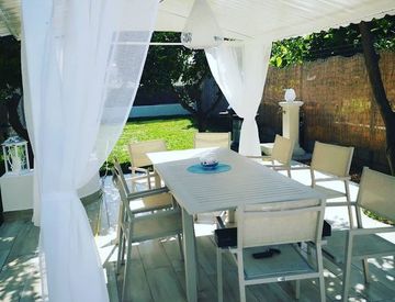 lL giardino privato è illuminato e dotato di doccia esterna ed una fontanella oltre ad essere impreziosito da una tettoia con tavolo e sedie per cene e momenti di svago all'aria aperta.