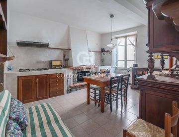 •Primo piano: ampio e luminoso soggiorno con cucina a vista, impreziosito da elementi architettonici tipici come cornici e stipiti in pietra e un grande camino in marmo e peperino. Completano il piano una sala da pranzo con parquet e una stanza con balcone.