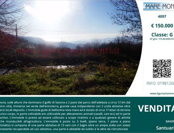 Savona, sulle alture che dominano il golfo di Savona a 2 passi dal parco dell'adelasia a circa 12 km dal centro città, immersa nel verde dell'entroterra, grande casa indipendente con 2 unità abitative oltre diversi locali deposito. L'immobile gode di bellissima vista mare ed è dotato di circa 17 ettari di terreno in unico corpo, in parte coltivabile e/o utilizzabile per allevamento animali (cavalli, cani ecc) ed in parte boschivo. L'immobile si presta...
