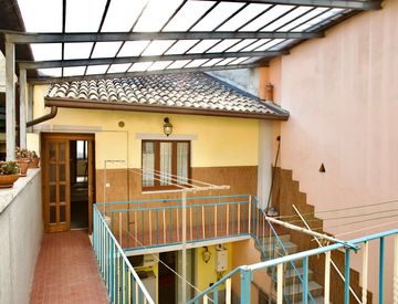 In zona centrale, proponiamo casa indipendente con cortile privato e negozio al piano terra. L'immobile è composto da ingresso, soggiorno con cucina a vista, disimpegno, camera da letto, bagno, stanza e terrazza di mq 25 al piano primo; locale di sgombero, disimpegno e bagno al piano terra. Il negozio di mq 60, ristrutturato nel 2002, è adibito attualmente a parrucchiere/barbiere. In attesa di APE. Euro 188.000