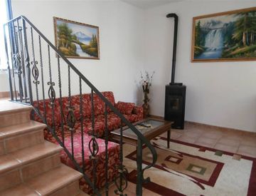 Al piano terra: ingresso/sala da pranzo con angolo cottura arredato; disimpegno con attacco lavatrice, bagno con finiture a mosaico con doccia, soggiorno con scala a vista.
