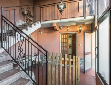 Primo piano: appartamento di 68 mq, anch'esso con tre locali, accessibile tramite una scala dal porticato.