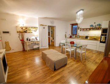 Al piano terra il primo alloggio con l'ingresso su un ampio soggiorno, tinello con cucinino, antibagno, bagno accessibile per disabili, una camera da letto e un locale deposito.