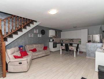 La porta di ingresso apre sull'accogliente zona giorno composta da zona soggiorno con parete tv e cucina a vista, questo ambiente di notevoli dimensioni può ospitare diverse persone e affaccia sul primo pezzo di area privata esterna, sempre sul piano troviamo il bagno di serizio con annessa lavanderia e la scala interna che conduce al piano superiore dove è presente la zona notte.
