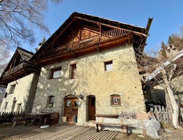 Lo chalet, ristrutturato preservando le caratteristiche architettoniche originali del 1714, unisce armoniosamente pietra e legno per offrire un equilibrio perfetto tra fascino alpino e confort moderno.