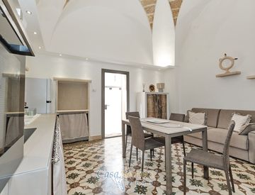 L’abitazione si sviluppa su un unico livello e si apre su un’ampia e luminosa zona living, impreziosita da splendide volte a stella, riportate alla loro originaria bellezza grazie al recupero della faccia a vista dei conci in pietra, disposti secondo un raffinato disegno geometrico.