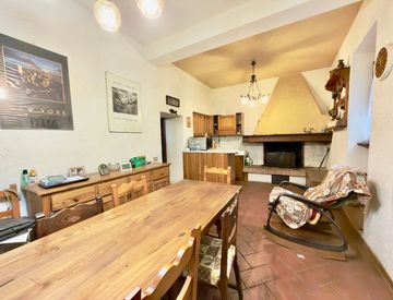 Al piano terra l’ingresso conduce a una cucina abitabile con camino, ambiente accogliente e centrale della casa, oltre a un bagno di servizio.