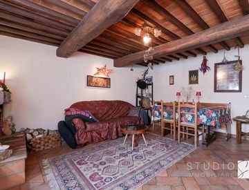 Gli interni conservano le caratteristiche tipiche dell'architettura rurale della zona: pavimentazioni in cotto, travi in legno a vista e una pittoresca facciata in pietra che conferisce all'insieme un carattere genuino e ben riconoscibile. Le condizioni, sia interne che esterne, sono ottime.