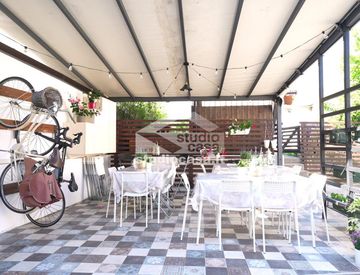 Affacciata su un patio/cortile di 70 m², l’area esterna è ideale per cene all’aperto estive, offrendo un’atmosfera conviviale e rigenerante dove sono presenti zona spa, sauna, vasca idromassaggio e due ripostigli comodi per attrezzature, asciugamani o prodotti benessere.