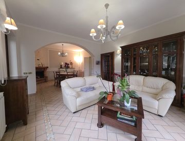 Da questo spazio si entra nell’abitazione, che si sviluppa in un ampio soggiorno con camino, cuore pulsante della casa, dove zona pranzo e zona living convivono in un’atmosfera calda e familiare.
