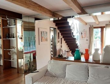 La ristrutturazione, seguita direttamente dal proprietario architetto circa vent’anni fa, ha definito un linguaggio coerente e riconoscibile. Il legno dei pavimenti e della travatura a vista conferiscono eleganza agli ambienti; acciaio, vetro e cemento introducono un segno contemporaneo. L’impianto resta armonico e consente, se lo si desidera, di orientare facilmente lo stile verso soluzioni più sobrie.