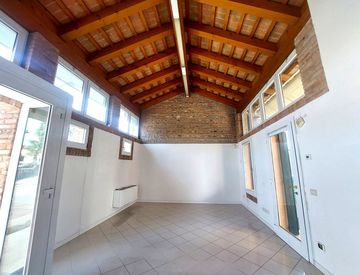 Gli ambienti sono impreziositi da una splendida travatura a vista e da suggestivi dettagli storici in pietra.