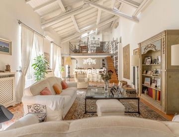 The generously sized living room, with ceilings decorated with exposed beams that reach about 8 meters, provides a fascinating view.