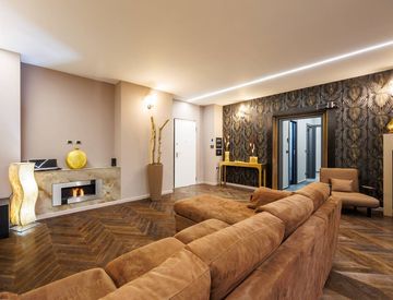 Ampia zona living con bio camino, pareti decorative, carte da parati dello stilista Roberto Cavalli e pavimento in legno a spina di pesce;