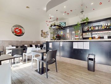 L’immobile dispone di triplo ingresso: i due ingressi principali si affacciano sulla strada e conducono alla zona ristoro, dotata di tavoli per la clientela, un bagno e un bancone con angolo bar. Dal bancone, tramite una botola, si accede al piano seminterrato dove si trovano un locale deposito e un secondo bagno, ideale come servizio per il personale o uso tecnico.