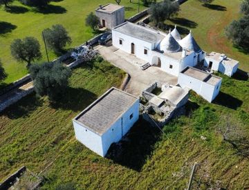 La proprietà ricade nell’agro di Ostuni ed è composta da un antico casolare con trulli, una corte centrale su cui si affacciano tre lamie di diversa dimensione e altezza, oltre a un tradizionale forno a legna. Il tutto è circondato da un terreno di poco superiore a un ettaro, che garantisce privacy e continuità visiva con il paesaggio circostante.