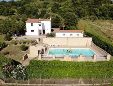 Casale in pietra ristrutturato in ottima posizione panoramica a due km dal paese composto da ingresso, cucina, soggiorno e bagno al piano terra e tre camere e bagno al piano primo. Bellissimo giardino per 1400 mq ben curato con piscina rialzata di 12 x 6 con locale tecnico . Il terreno è di circa otto ettari con 215 piante di olivo, frutti e pozzo. Annesso adibito a rustico di 70 mq con possibilità di cambio d'uso, e altro annesso di 40 mq per trattori...