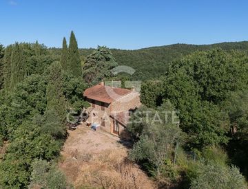 Al primo piano, accessibile da scala esterna: open space con cucina e camino, sala da pranzo, soggiorno, 2 camere e bagno. Giardino alberato con vista su Pienza e Monte Amiata, ideale per vivere all’aperto. Terreno di ca. 13,5 ha con oliveto e bosco.