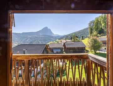 Circondata da paesaggi naturali intatti, la casa offre una vista unica su un ampio scenario alpino, con prati rigogliosi d’estate e un panorama che abbraccia le maestose cime del Sas dla Crusc e del Sas de Pütia.