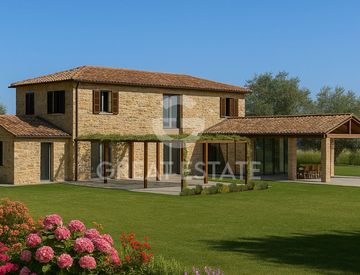 In splendida posizione panoramica, immerso nel verde e nella quiete della campagna, è disponibile un progetto per la demolizione dei fabbricati esistenti e ricostruzione di un casale indipendente di circa 229 mq su due livelli, con ampi spazi esterni, piscina privata e terreno di circa 1,3 ettari comprensivo di uliveto.