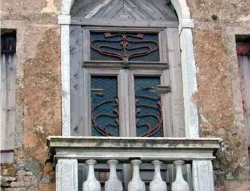 Portefinestre al piano nobile con cornice in pietra e decoro alle imposte e in chiave. La stessa decorazione si ripete nel sottostante portale d'ingresso.