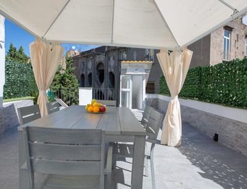 L'appartamento dispone un terrazzo giardino e solarium all'ultimo piano.
