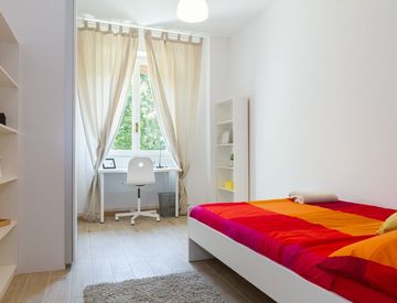 Questa stanza luminosa di 15,43 m² in un appartamento di 3 locali propone un comodo letto queen e l'accesso a un bagno (totale 1 bagno) in un appartamento di 90 m², ideale per la convivenza fra studenti e giovani professionisti.