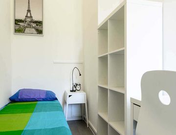 Cette chambre fait 10 mètres carrés et donne accès à une salle de bain partagée. Profitez de la commodité d'un ascenseur, du WiFi, d'une télévision et d'une machine à laver. L'appartement comprend également un lave-vaisselle et un fou....