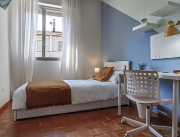 Our little gem! The bed features storage drawers for clothing or less frequently used bags. The room includes a desk with a dedicated lamp for studying, a bookshelf, and a wardrobe with well-organized compartments for shirts, sweaters, linens, and shoes.