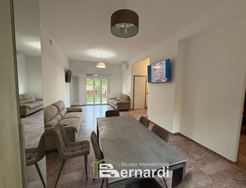 Vi è un'ampia cucina con lavastoviglie (14 mq) una sala di quasi 40 mq. con due divani, due smart tv, lavastoviglie e lavatrice.